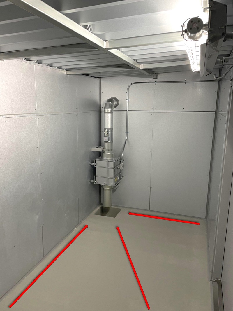 - 溜桝に向かって1/100の三次元的な勾配を設けることで、ピットを用いずに漏れ出た危険物を溜桝に集めます。